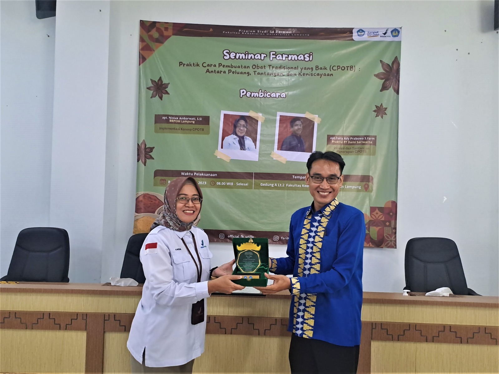 Program Studi S1 Farmasi Jurusan Farmasi Fakultas Kedokteran Universitas Lampung menggelar Seminar Farmasi bertema “Cara Pembuatan Obat Tradisional yang Baik (CPOTB): Antara Peluang, Tantangan dan Keniscayaan”, Rabu, 23 Agustus 2023 di Gedung A Lantai 2 FK Unila.