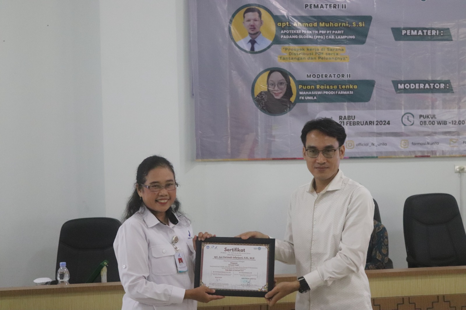 (Unila): Program Studi (Prodi) S-1 Farmasi Jurusan Farmasi Fakultas Kedokteran (FK) Universitas Lampung (Unila) menggelar Kuliah Umum bertema “Implementasi CDOB oleh PBF dan Prospek Kerja Tenaga Kefarmasian: Antara Peluang dan Tantangannya”, Rabu, 21 Februari 2024, di Gedung A lantai dua FK Unila.