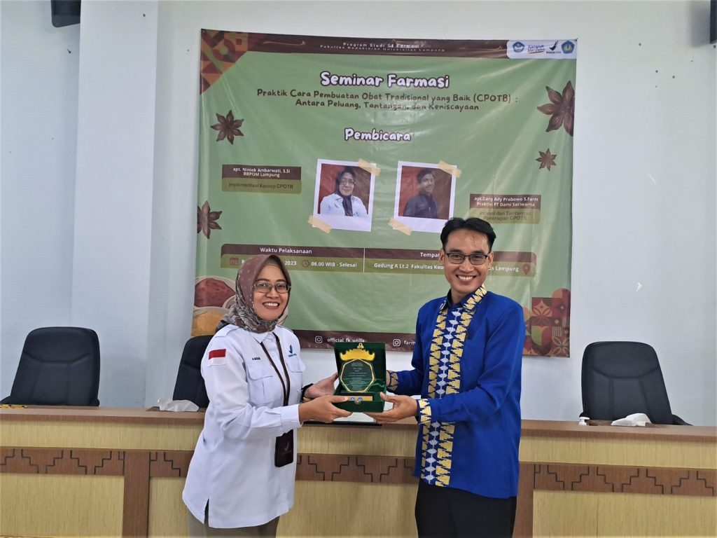 FARMASI UNILA GELAR SEMINAR CPOTB: ANTARA PELUANG, TANTANGAN DAN KENISCAYAAN Uncategorized April 10, 2026 admin Program Studi S1 Farmasi Jurusan Farmasi Fakultas Kedokteran Universitas Lampung menggelar Seminar Farmasi bertema “Cara Pembuatan Obat Tradisional yang Baik (CPOTB): Antara Peluang, Tantangan dan Keniscayaan”, Rabu, 23 Agustus 2023 di Gedung A Lantai 2 FK Unila. Kegiatan ini merupakan kegiatan rutin tahunan prodi dan merupakan kegiatan untuk pemenuhan Indikator Kinerja Utama (IKU). Penyelenggaraan Seminar CPOTB merupakan salah satu upaya untuk meningkatkan pengetahuan dan kompetensi bagi calon apoteker /apoteker/penanggung jawab teknis di sarana produksi obat tradisional khususnya dalam implementasi penerapan CPOTB di sarana produksi. Seperti yang diketahui, pengembangan obat tradisional sekarang dikenal dengan istilah OMAI (obat modern asli Indonesia) merupakan komoditi yang banyak digunakan oleh seluruh lapisan masyarakat baik dari segala usia maupun tingkat perekonomian serta banyak dikembangkan oleh pelaku usaha. Hal ini terlihat dari penggunaannya yang semakin luas dan tingginya permintaan dan kebutuhan konsumen terhadap obat tradisional. Pemastian mutu saat produksi Obat Tradisional adalah hal penting untuk upaya perlindungan masyarakat selaku konsumen dalam mengkonsumsi obat tradisional, oleh karena itu diperlukan peningkatan pemahaman pelaku usaha atau calon entrepreneur terhadap CPOTB. Dalam rangka pengawasan post market produk obat tradisional, dilakukan pemeriksaan terhadap sarana Obat Tradisional terkait pemenuhan penerapan CPOTB. Peran apoteker diperlukan untuk menjamin obat tradisional yang memiliki efek, aman dan bermutu sampai di tangan masyarakat. Sesuai dengan kaidah pedoman CPOTB apoteker adalah personil kunci di industri obat tradisional. Kegiatan ini menghadirkan dua narasumber berpengalaman di bidangnya yaitu apt. Niniek Ambarwati, S.Si., selaku Fungsional Analis Obat dan Makanan BBPOM di Bandar Lampung dengan topik materi “Implementasi Konsep CPOTB”, dan apt. Dany Adi Prabowo, S.Farm., Praktisi PT Dami Sariwarna yang berlokasi di Tangerang Selatan-Banten dengan topik materi “Inovasi dan Tantangan Penerapan CPOTB”. Kegiatan ini sejalan dengan visi dan misi FK Unila yang memiliki kekhususan berbasis agromedicine dan visi Prodi S1 Farmasi UNILA yakni menjadi Prodi Sarjana Farmasi yang unggul dengan kekhususan pemanfaatan bahan alam berbasis agrofarmasi. Salah satu misinya adalah mengembangkan penelitian dan inovasi di bidang farmasi yang berorientasi kepada kepentingan akademik dan masyarakat berbasis agrofarmasi dengan pemanfaatan bahan alam. Seminar CPOTB diikuti oleh para dosen farmasi dari berbagai perguruan tinggi di Provinsi Lampung yang memiliki Prodi Farmasi seperti ITERA, Universitas Malahayati, STikes ADILA, Universitas Tulang Bawang, AKFAR CEFADA, dan lainnya, Dosen FMIPA dan FP Unila, serta alumni farmasi pertama Farmasi UNILA angkatan 2019. Rangkaian acara seminar dimulai dengan acara pembukaan dengan menyanyikan lagu Indonesia Raya dan Hymne Unila lalu pembacaan do`a pembuka. Acara dilanjutkan dengan sambutan dari Ketua Pelaksana apt. Zulpakor Oktoba, S.Si., M.Farm dan Ketua Jurusan Prodi Farmasi FK Unila sekaligus membuka kegiatan ini, dr. Oktafany, M.Pd.Ked. Disela – sela acara, disuguhkan pulan persembahan lagu klasik daerah Lampung “Sebik Hati” yang dibawakan secara khusus oleh mahasiswa farmasi Unila. “Seminar ini diharapkan memberikan wawasan, inspirasi, manfaat lebih bagi para peserta untuk membaca peluang terkait pengembangan obat tradisional terutama industri ekstrak bahan alam seperti UKOT, UMOT dan IOT di Lampung dan di Indonesia.”, ujar apt. Zulpakor. Acara inti yang dipandu langsung oleh apt. Ihsanti Dwi Rahayu, M.S.Farm yang menjadi moderator pemateri pertama dan kedua. Setelah pemaparan materi dilanjutkan sesi diskusi dan tanya jawab serta pemberian doorprize bagi penanya terbaik yang dipilih langsung oleh narasumber. Sebelum mengakhiri seminar, peserta diminta mengisi post test dan pengisian feedback untuk mengukur ketercapaian penyampaian muatan materi yang diterima oleh para peserta seminar CPOTB. Berita Lainnya Mahasiswa KKN Unila Desa Budi Lestari Resmi Menyerahkan Peta Desa kepada Perangkat Desa Penyelesaian Rocket Stove oleh Mahasiswa KKN Unila di Balai Desa Budi Lestari Tingkatkan Branding Produk Lokal, Mahasiswa KKN Unila Pasang Banner di UMKM Desa Budi Lestari Agenda Lainnya Agenda Musyawarah Desa Agenda Kegiatan Masyarakat Agenda Kegiatan Kesehatan Desa Bagikan Postingan Ini